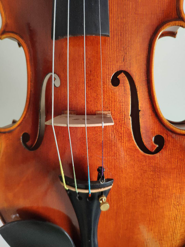 評價:這是一把非常美麗的雀眼楓背板的手工小提琴,整體顏色看上去較紅,背板上零星散落的雀眼雖然不過,但是和木材上面的深色云紋搭配起來會顯得非常美觀。面板的木質非常均勻,木紋的平均距離都在1.5毫米左右。就琴的聲音來說,我個人感覺是聲音比較平穩,共振比較好。